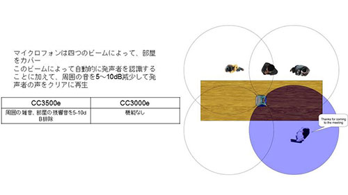 さらに、大人数となる会議の際はオプションの拡張マイクを使用することで、周囲最大8.5mまで音のピックアップ範囲を広げることができる。