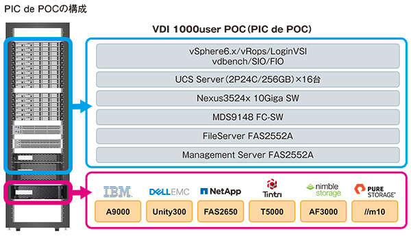 PIC de POCでは、2000ユーザーまでのVDI環境に対応できる環境を構築。Login VSIというIOシミュレーションソフトを活用し、パフォーマンスを検証する。
