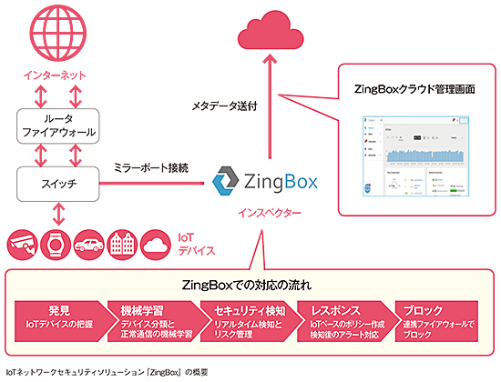 その一つが、1月23日のリリースで取り扱い開始を発表したIoTネットワークセキュリティソリューション「ZingBox」だ。本ソリューションはネットワーク上を流れるIoTデバイスのパケットを収集、メタデータ化したうえでクラウドへ送って機械学習により分析を行う。
