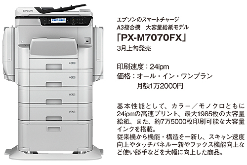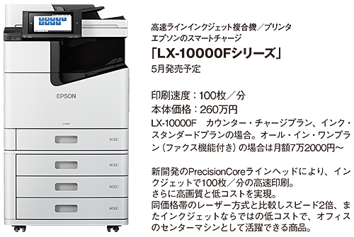 また、2017年2月2日に高速ラインインクジェット複合機/プリンタ「LX-10000Fシリーズ」(100枚/分)、「LX-7000Fシリーズ」(75枚/分)、および「エプソンのスマートチャージ」対応モデル「PX-M7070FX」「PX-S7070X」を発表し、これにより、SOHOからデスクサイド、オフィスのセンターマシンまですべてのオフィスにインクジェットを導入いただけるラインアップが整いました。