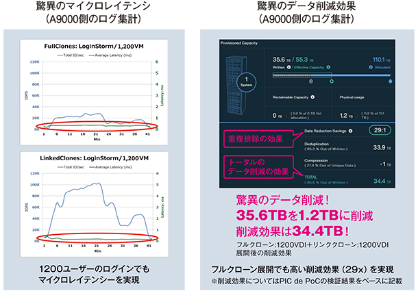 データ転送における指標であるレイテンシの検証では、フルクローンとリンククローンに関係なく、高いパフォーマンスを発揮した。「FlashSystem A9000は、検証した1200ユーザーでは最後まで1ミリ秒を超えることがなかった。ハイパーバイザーやミドルウェア(データベース)によってはストレージのレイテンシで厳しい利用条件もあるが、その心配はまったくない」と武田課長。コントローラーのキャッシュのヒット率はフルクローン、リンククローンの両方で7割以上となり、フラッシュ・モジュールへの負荷軽減も実現している。