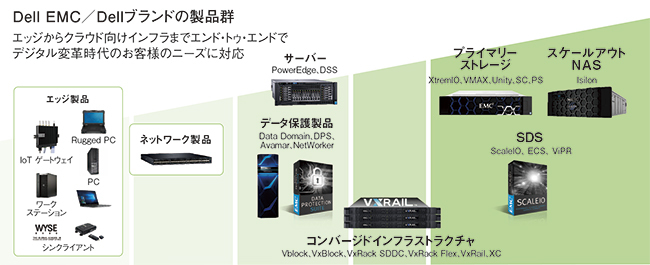 デルテクノロジーズの「Dell」ブランドの製品には、クライアントPC、ワークステーション、シンクライアント、IoTゲートウェイなどの製品がある。「Dell EMC」ブランドの製品には、サーバー、ネットワーク、ストレージ、データ保護製品、SDS(ソフトウェア・デファインド・ストレージ)の他に、いま話題となっているコンバージドインフラも含まれる。松本副社長は、「ワンストップでITインフラのすべてをお届けすることができる」とアピールする。