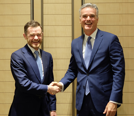 固く握手するインテルのアンドリュー・ムーア氏(左)とSAPのグレッグ・マクストラヴィック氏