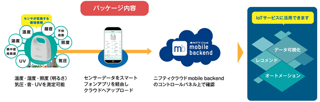 上野 具体的には、オムロン様が開発したIoT向け「環境センサー」での連携があります。この環境センサーは、小型で温度、湿度、気圧、照度、UV、騒音、をリアルタイムに計測し、無線でデータ送信します。当社はIoTを活用したアプリケーションの企画・開発でノウハウを提供し、専用のスマートフォンアプリを開発しました。温度や湿度から計算した「不快指数」「熱中症危険度」の閲覧や、データが設定値を超えた際に通知する機能などを備えており、またセンサーで取得したデータを「一切の開発を行わずクラウドへ自動保存」できることが最大の特徴になっています。住宅や建材メーカーをはじめ、ベッドメーカーが介護や見守りに活用するなど、多岐に渡る用途でご活用いただいています。この環境センサーとスマートフォンアプリと、収集したデータを蓄積・管理するためのクラウドサービス(ニフティクラウド mobile backend)を、オムロン様と連携してセット商品化したものが「IoTトライアルキット」になります。