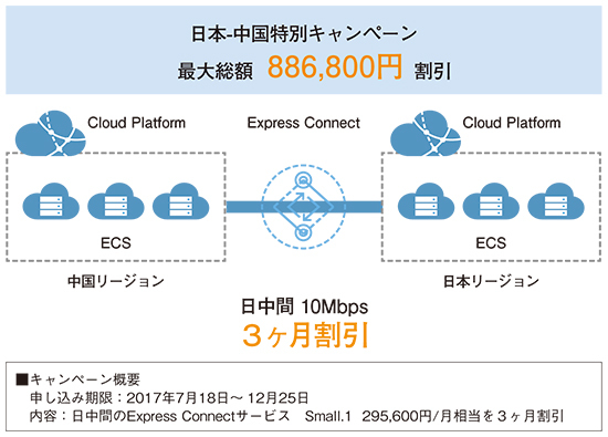 さらに、Express Connectの提供開始に合わせ、10Mbpsプランの月額料金3か月分にあたる最大総額88万6800円が割引される「日本-中国特別キャンペーン」を始めた。キャンペーンの期間は12月25日までで、Express Connectの利用と同時に、月5万円以上のSBクラウドのサービスを契約することなどが条件となる。