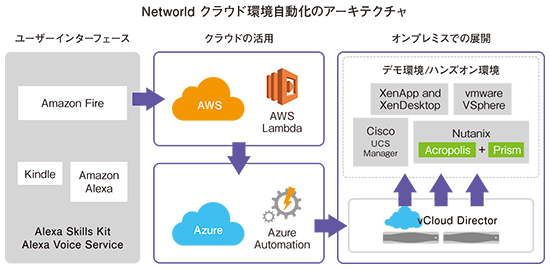 では、ネットワールドが実現しようとしている究極のインフラ運用とは何か。平松部長は、「手を使わずに、誰でも利用でき、すぐに利用できること」という。その解として、iPhoneの「Hey! Siri」と同じように、音声を使って操作できる「Hey! GARAGE」の開発に取り組んだ。三大要素は、AI音声アシスタント「Amazon Alexa」、AWSとMicrosoft Azureの「クラウドサービス」、そしてそれらを活用した「自動化」だ。音声入力インターフェースとしてAmazon Alexaを搭載したタブレット端末「Amazon Fire タブレット」を活用し、AWSとMirosoft Azure、そしてオンプレミスにあるVMware vCloud Directorを経てハンズオンセミナー環境を自動でプロビジョニングする。