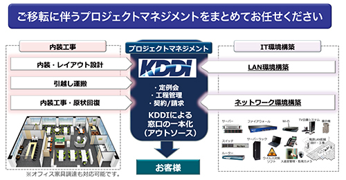 すでにKDDIは、オフィス移転・開設のサポートで100件近くの実績をもっている。内装設計や工事、引っ越しなどの業者と深い関係を構築しているため、例えば、予定していた内装に変更を加えたいという場合にも、各業者と連携してトラブルを未然に防ぎ、希望の予算内でスケジュール通りの環境構築につなげられる。