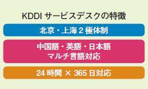 自社内にITの専任者がいない、また、専任者がいても、転職などで担当者が頻繁に入れ替わるので、ノウハウが定着されないという悩みを抱える日系企業は少なくないのではなかろうか。そんな企業に対して、KDDIではITの運用業務をワンストップでまるごと請け負うサービスを提供している。上海と北京に設置した「ネットワークオペレーションセンター(NOC)」の専任チームが、24時間365日サポートしてくれるのだ。中国語・英語・日本語のマルチ言語で対応するうえ、中国国内に約20拠点をもつ強みを生かして、遠隔地からの問題解決が難しい場合には、自社スタッフが客先に駆けつけて対応してくれる。
