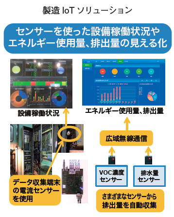 製造業の生産の現場において生産効率の向上を図る代表的な取り組みの一つが設備の稼働率を高めることだ。しかし、日系製造業が中国に構える工場には日本から現物出資で移転した中古設備も多く、また複数のメーカーの多様な仕様の設備が混在しており、稼働率を一様に収集することが容易ではない。KDDIが中国で提供する「MC-Web CONTROLLER」は設備の制御盤の中にある稼働信号配線に電流センサを挟み込むだけで設備からさまざまなデータが収集できるすぐれものだ。ネットワークのインターフェースをもたない旧型でも配線工事や設備を停止することなく、多様な設備に対して共通の方法で、運転開始時間や停止時間、サイクルタイム、ショット数などのデータを自動収集する。その他にもさまざまなセンサを活用し、水や電気、蒸気などの使用量や排水、VOC(揮発性有機化合物)濃度などの排出量を見える化。コスト削減や環境対策につなげるエネルギーIoTやタブレット端末の電子帳票を用いて工場内で人が直接目で確認する作業の記録や報告を簡単に素早く電子化する「ConMas i-Reporter」、収集・蓄積したデータをグラフィカルに可視化するダッシュボード「MotionBoard」など、ユーザーのIoT活用を支援する幅広い製品群をラインアップ。収集から通信、蓄積、そして活用に至るまで、ネットワーク環境さえあれば工場の状態がいつでもどこでも簡単に見える仕組みを一気通貫で提供している。