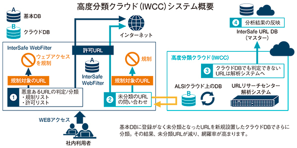 新設の高度分類クラウド IWCCは、従来のフィルタリング用URLデータベースに加えて機能する第2のエンジン。従来のURLデータベースが網羅できなかった残り2%の未知のURLに対応するため、ワールドワイドでのユーザーアクセスデータの反映を強化した。主に、サイバー攻撃の温床になりやすいニッチなサイトや一時的にオープンするサイトなどをクラウド上で収集して、アクセス判定する。リアルタイム性が高いため、新たな攻撃にもすばやい対処が可能になる。さらに、IWCCでも未分類となった未知のURLは、アクセス規制により不審な通信を防止する。このIWCCの解析システムは、ALSI独自のアルゴリズム(特許出願中)を採用している。
