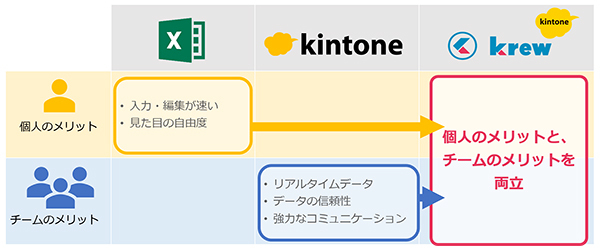 山崎 kintoneには、Excelを凌駕したメリットがあります。とはいえ、不得意な部分もあるので、それを補足するために、krewの存在意義があると考えています。
