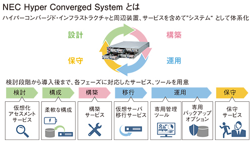 NEC Hyper Converged Systemのもう一つの大きな特長は、HCIの検討から構築、移行、運用、保守といった各フェーズに対応した手厚いサービスとツールを用意し、ユーザーのHCI導入・運用を一貫してサポートしている点だ。