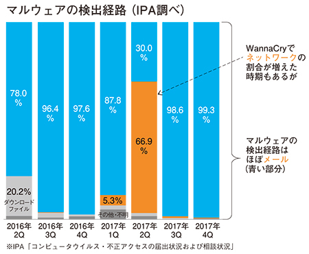 その年に社会的に大きな影響をおよぼしたセキュリティ脅威をランキング形式で公表する情報処理推進機構(IPA)の「情報セキュリティ10大脅威」。17年の一年間を対象とした「情報セキュリティ10大脅威 2018」が1月に発表され、「組織」のカテゴリで「標的型攻撃による被害」が1位となった。標的型攻撃が1位になるのは3年連続4回目で、15年以来、依然として大きな脅威となっていることがわかる。マルウェアの侵入経路のほとんどがメールだ。IPAの調査によると、16年以降に検出されたマルウェアのうち、メールから検出されたものは、四半期ベースで毎回ほぼ9割を超える。17年第2四半期に関しては、5月にランサムウェア「WannaCry」が大流行したことで、ネットワークがその割合を押し上げているが、ウェブなどのネットワークの対策もメールに次いで重要になる。
