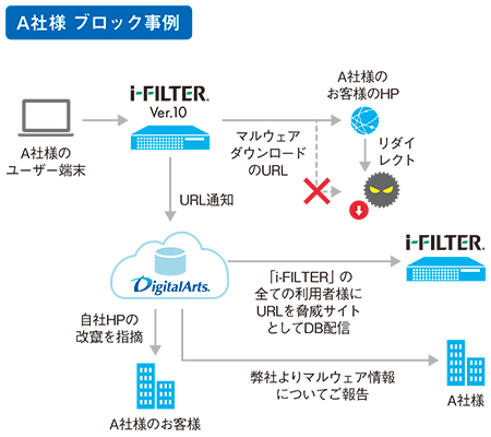 2017年12月上旬に弊社のクラウド上のDBに、A社様から『カテゴリ外』のURLが通知されました。弊社でそのURLを確認したところ、マルウェアをダウンロードするURLであることがわかりましたので、「i-FILTER」の全ての利用者様にそのURLを『脅威サイト』としてデータベース配信をその日のうちに実施しました。