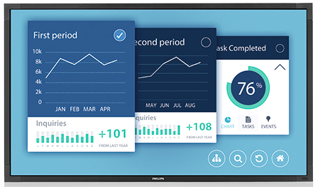 MMDが販売するPhilipsブランドのデジタルサイネージ用ディスプレイは、今まで主力だった業務用スタンダードモデル「Eライン」の後継機種となる、高信頼性と極薄ベゼルを実現したデザイン性が特徴の新モデル「Pライン」と、Android OSとWi-Fiを搭載してディスプレイ単体で外部コンテンツを表示できるウェブサイネージモデル「Dライン」が主力だ。このほか、価格を抑えたエントリーモデル「Qライン」や4K対応ハイクオリティ表示のプロフェッショナルモデル「Uライン」まで、4モデルが用意されている。画面サイズも55インチ型を中心に32インチから84インチまで幅広い展開となっている。また、Pラインと同時発売となる後述のタッチ専用モデル「Tライン」が4月からラインアップに加わった。