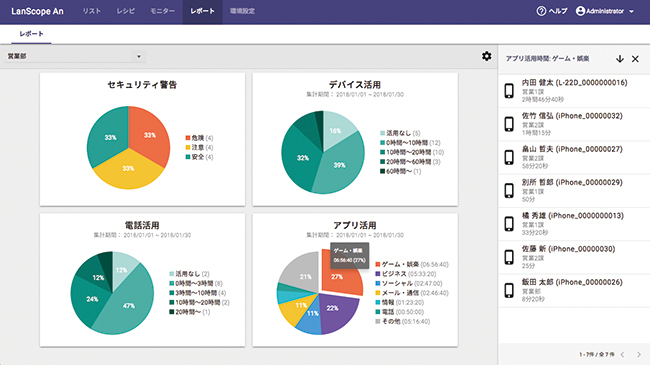 LanScope An Ver.3.0画面例(端末利用状況のレポート画面)。新たに利用ログ取得に対応したiOSでは、