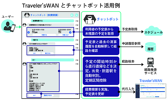 今回のバージョンアップでは、かねてから研究してきたチャットボットとの連携機能を実装する(今年6月末にリリース予定)。日立システムズのチャットボットは、同社が開発する各種の業務システムと連携し、入力作業を減らして業務効率を高める役割を担う。適用の第一号が今回の「Traveler'sWAN」となった。