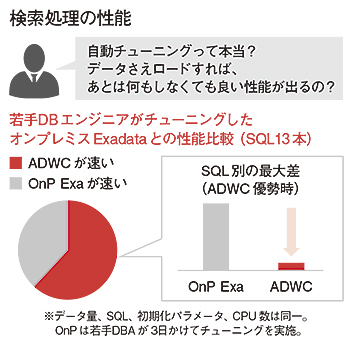 まず、ADWCの検索処理性能について検証し、各エンジニアが3日間かけてチューニングしたオンプレミスの「Oracle Exadata(Exadata)」との性能比較では、ADWCは基本的にデータのロードのみで実作業はゼロでありながら、かなりのパフォーマンスを発揮したという。