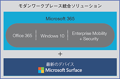 マイクロソフトは、「モダンワークプレース統合ソリューション」として、Microsoft 365とSurfaceを提供している。Microsoft 365は「Office 365」「Windows 10」「Microsoft Enterprise Mobility + Security(EMS)」を組み合わせた、安全な環境で誰もが創造性を発揮しながらチームワークを高めるためのソリューション。そこに設計段階からWindowsやOfficeチームが携わり、Microsoft 365に最適化して開発された最新デバイスSurfaceを活用することで、Microsoft 365の価値を100%引き出し、働き方改革をより強力に推進することができる。