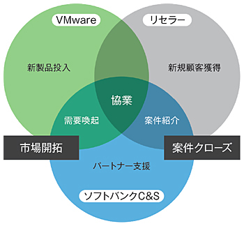 この反省を生かし、約2年前から結果を出すマーケティングを意識し、案件化からクロージングまで積極的にかかわるようにした。需要喚起に力を入れる姿勢を明確にしたVMware、クロージングに欠かせない販売パートナーとともに、3者が協力し合って顧客に向き合う体制をつくり上げたという。