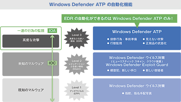 Windows DefenderシリーズにおけるEDRは、Windows DefenderATPだ。脅威の検知から調査・分析、可視化、対処に至るまでの一連の機能を完備し、世界中からマイクロソフトが収集したインシデント情報などをもとに、迅速かつ適切な対応を可能にする。