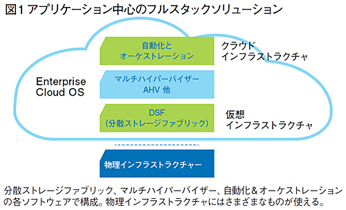 ニュータニックスのHCIは、HCIとしての全ての機能をソフトウェアによって実現している点に特徴がある。アーキテクチャとしては、ベースとなる物理インフラストラクチャ(サーバーやIaaS)に限定はない。その上で、マルチハイパーバイザー、分散ストレージファブリック、自動化とオーケストレーションの3種類の基本機能を稼働させる構成だ(図1)。