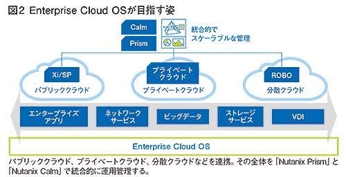 そこで同社が打ち出したのが、「Enterprise Cloud OS」というコンセプトである(図2)。「Enterprise Cloud OSは、企業・団体が利用する情報システムの全体を支える単一の基盤として、全てのクラウドを一つのOSとして、1クリックで管理できる」と町田社長。例えば、パブリッククラウド、プライベートクラウド、リモートオフィス/支店・営業所向けの分散クラウドを統合的かつスケーラブルに管理できるようになるのである。