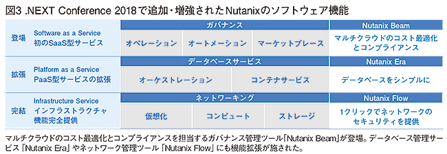 ニュータニックスが提供するツールは、今後も、年2回のメジャーアップデートやニュータニックス主催の大規模イベントの際に継続的に追加・増強していく予定だ。例えば、18年5月に米ニューオーリンズで開催されたイベント「.NEXT Conference 2018」では、マルチクラウドのコスト最適化とコンプライアンスを担当するガバナンス管理ツール「Nutanix Beam」が登場。データベース管理サービス「Nutanix Era」や、ネットワーク管理ツール「Nutanix Flow」にも機能拡張が施された(図3)。
