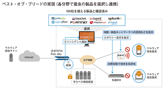 さらに、セキュリティリスクの分析は、ClearPassが直接実行するものだけでなく、100社を超えるサードパーティー製のセキュリティ製品ともAPIで連携する。天野部長によれば、「セキュリティリスクもさまざまなものがあるので、ベスト・オブ・ブリード戦略を採っている」という。「例えばファイアウォール専業メーカー、エンドポイントセキュリティ専業メーカーなど、強みが明確な他ベンダー製品をClearPassと連携させ、そこで脅威を見つけてくれたらこちらに通知してもらい、ClearPass自身のプロファイリングと合わせて必要なセキュリティポリシーをエッジ側に指示する。ClearPassをフォーカルポイント(注視点)と位置づけて、ネットワークの入り口で制御するという考え方を実現していると考えてもらえるとわかりやすい」。