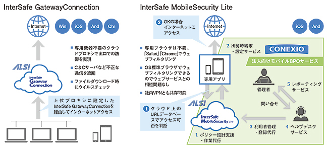 こうした企業に対し、ALSIはクラウドで提供する「InterSafe MobileSecurity Lite」と「InterSafe GatewayConnection」という二つのソリューションを提案する。