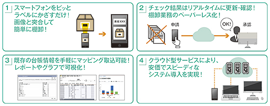 もう一つのソリューションであるProPlus Pitでは、会計用の固定資産台帳とは別に現物管理用の台帳を管理することができる。このソリューションの特徴はクラウドサービス(SaaS)として提供され、専用アプリによりスマートフォンで現物を管理するという点にある。現場での使い方は、資産ラベルに印刷したバーコードをスマホのカメラで読み取るだけだ。あとはシステム側でリアルタイムに更新処理を行ってくれる。