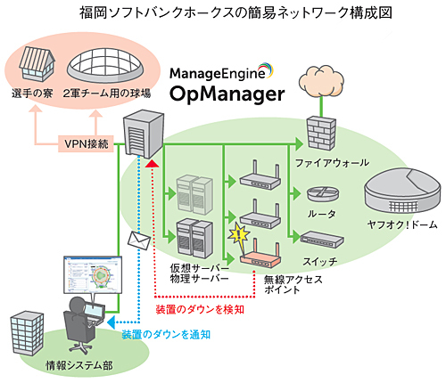 ManageEngineシリーズのユーザーである福岡ソフトバンクホークスでは、サーバー・ネットワーク統合監視製品の「OpManager」を導入、ヤフオク!ドームなどで稼働する数百台ものネットワーク機器を集中監視している。OpManagerの導入前は外部業者に監視を委託していたが、費用面の都合から主要部分の監視に限定していたことなどが原因で、障害発生に気付くのが遅れることもあった。しかし、OpManagerの導入によって、監視にまつわるコストが大幅に削減されたことに加え、機器配置が一目で分かる「ビジネスビュー」機能により、迅速な障害対応を実現したという。