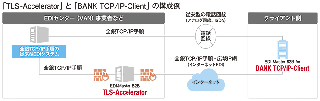 TLS-Acceleratorは、全国銀行協会(全銀協)が97年に定めた「全銀協標準通信プロトコル(TCP/IP手順)」(全銀TCP/IP手順)をインターネット回線で安全にやりとりできるための暗号化部分を担う。EDIセンター側となっている大手製造業、卸売業、金融業、VAN事業者を主な販売ターゲットとしている。受注者(サプライヤー)側に多いクライアント端末向けに、「EDI-Master B2B for BANK TCP/IP-Client」をV9で暗号化対応。TLS-AcceleratorとBANK TCP/IP-Clientを使うことで、既存システムの改修を最小限に抑えつつ、インターネットEDIへの移行が可能になる。