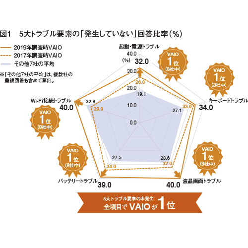 BCNの調査では「5大トラブル」(起動・電源、キーボード、液晶画面、バッテリー、Wi-Fi接続)に関して、VAIOのPCユーザーは「発生していない」率が他の7社と比較して最も高かった。しかも、発生率自体が前回調査よりも改善している。