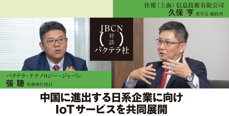 中国のIT企業として最大手に位置するパクテラ・テクノロジー・ジャパン(パクテラ社)。JBCCホールディングスの子会社で、中国に進出する日系企業のIT活用をサポートする佳報(上海)信息技術有限公司(JBCN上海)は、このほど同社と協業し、パクテラ社のIoTプラットフォーム「Pactera OctoIoT」の拡販を推進していく。協業の背景とPactera OctoIoTによるビジネス展開について、JBCN上海の久保亨・董事長総経理とパクテラ社の張聰・常務執行役員に語ってもらった。