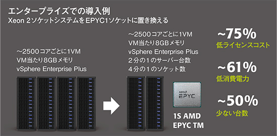 特に、仮想化環境におけるメリットは大きい。1ソケットで2ソケット分の性能や機能を実現していることで、TCO削減にも大きなメリットをもたらす。「例えば、VMwareの場合は課金単位がCPUソケット単位になっているため、2ソケットの性能や機能を1ソケットで実現できることによってコスト面に大きなメリットとなる。ほかにも、エンタープライズ系のソフトウェアの課金単位はソケット数に依るものが多く存在しているため、ライセンスコストを含めたTCOの削減が可能だ」(林田代表取締役)と強調する。