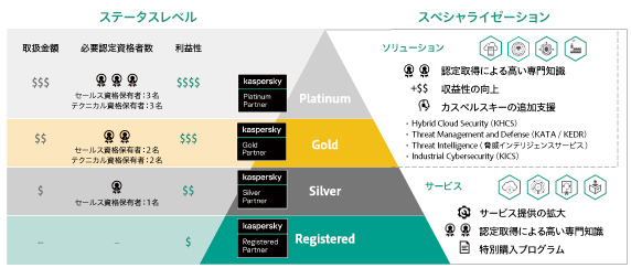 Kaspersky Unitedの基本的なメニューには、年間売上金額やセールス・技術の認定取得者数などに応じて「Registered」「Silver」「Gold」「Platinum」の4段階のステータスが用意されている。認定技術者の数や売り上げなどの要件を満たすことでステータスも上昇し、インセンティブ比率とともに収益性も高まっていくという仕組みだが、これはあくまでスタンダードな枠組みである。
