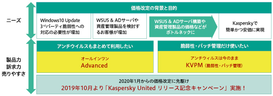 Unitedプログラムの運用開始に合わせ、2020年1月1日から、法人向けエンドポイントセキュリティの最上位の統合製品である「Kaspersky Endpoint Security for Business Advanced」(Advanced)と、法人向け脆弱性およびパッチ管理用セキュリティ製品「Kaspersky Vulnerability and Patch Management」(KVPM)のライセンス販売価格を改定する。現在、キャンペーンとして大幅に価格を抑えて提供しているが、これがそのまま適用される形だ。