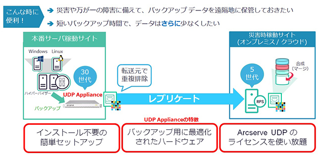 Arcserve UDP 8000シリーズは、遠隔バックアップにも対応する。自前で災害対策サイトを用意できない場合は、オンプレミスのバックアップデータをArcserve UDP Cloud Hybridに容易に複製し、遠隔でバックアップすることができるサービスも提供している。