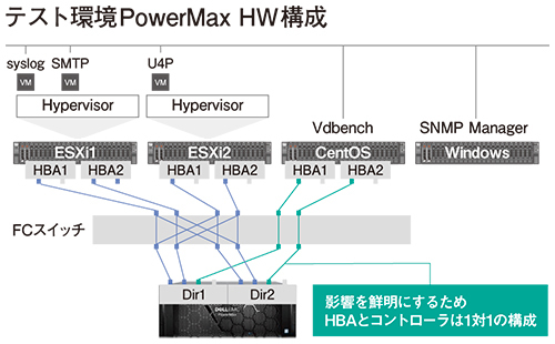 テスト環境PowerMax HW構成は別図の通りで、メインの負荷試験ツールであるvdbenchを接続したCentOS搭載機については、影響を鮮明にするため、あえてHBAとコントローラは1対1というシンプルな構成とした。テスト方法は、vdbenchを配置したサーバーからI/Oをかけ、PowerMaxに搭載された各パーツに擬似障害を発生させるもの。