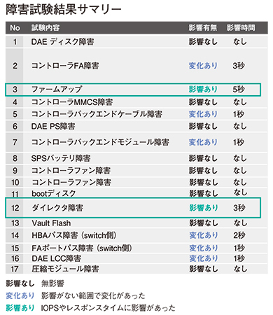 滝山田氏は、「全部で17の試験を実施した結果、IOPSやレスポンスに影響ありと判断された項目は、ファームウェアアップデートとダイレクタ(コントローラ)障害の2項目のみと優秀だった」という。