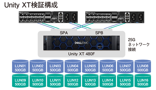 今回、検証に使用したのはUnity XT480Fモデル。各スイッチ/サーバーとも全て25Gネットワークで接続し、1つのSP(コントローラ)から出る物理線が2本と4本のパターンを用意。また、1台のVM(仮想マシン)がつかむLUNも1つと2つのケースを用意し、8または16の構成として、パスの増減によるパフォーマンスの変化とLUN数によるパフォーマンスの変化を検証した。