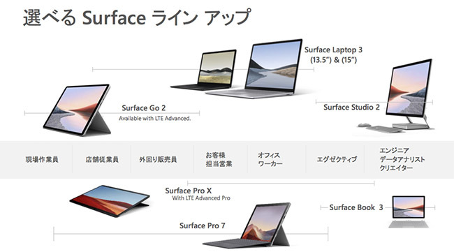 豊富なラインアップもSurfaceの魅力の一つだ。標準機での導入が最も多い定番の2in1 PC 「Surface Pro」、10.5インチディスプレイを搭載しながら500g台と軽量コンパクトな「Surface Go」、超高速接続を実現し携帯性に優れた「Surface Pro X」、美しいデザインと色から選べるクラムシェル型の「Surface Laptop」、高性能で本格的なクリエイティブワークもサポートする「Surface Book」、さらにLTEモデルもラインアップに揃えており、さまざまな職種・用途に合わせた選択が可能だ。