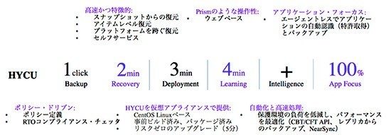HYCUが特徴とするのが「簡単」「シンプル」であること。製品はCentOSをベースに必要機能がパッケージ化された仮想アプライアンスの形で提供され、OS費用や構築が不要だ。導入は「3分ほどで展開可能で、運用もウェブベースでNutanixの管理ツール『Prism』を使っている人ならすぐに操作でき、1クリックのバックアップ、スナップショットからの2分でのデータリカバリーが実現する。しかも、エージェントレスで動作し、VMwareや物理環境、アプリケーションも全てエージェントを使うことなく「統合データ保護を実現する」と語る。
