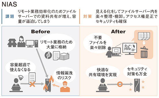 NIASを適用すればファイルサーバー全体が「見える化」され、データ増加の傾向、長期間の未参照・重複など整理すべきデータの割合をグラフィカルな画面で確認、更には移動・圧縮・削除などの方法で整理を行うことが可能だ。