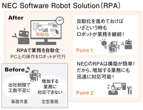 だが、一口に「RPAで自動化」といっても、業務の選定やロボットの作成・ユーザー教育など、運用開始までにはさまざまなプロセスが必要で、「今すぐ」自動化を始めるのは難しい。その課題を解決するのが「NEC Software Robot Solution」だ。
