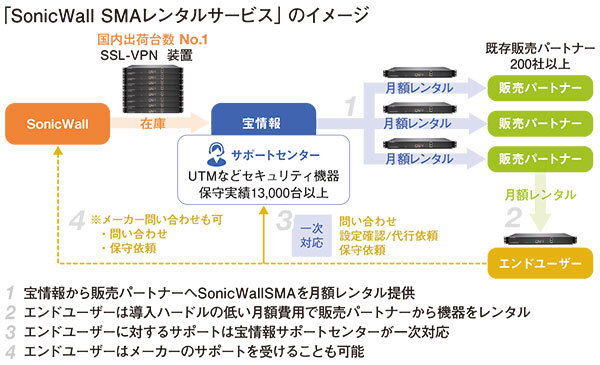 そこで、宝情報は「SonicWall SMAレンタルサービス」という商材を企画・開発。20年5月から同社の販売パートナー向けに供給を開始した。