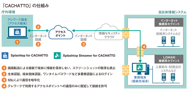 CACHATTOは、2021年1月時点で1400社70万人を超えるユーザーが利用。「スマートデバイス用リモートアクセスツール」市場や「セキュア・ゲートウェイ/ブラウザ」市場でトップシェアを誇る。販売強化を進めているのが地方自治体だ。昨年11月に自治体向け閉域接続リモートアクセスサービス「CACHATTOリモートデスクトップ for Government」の提供も開始している。同製品は、キャリアの提供する閉域接続サービスを介して、外部の専用端末から庁内のLGWAN接続系セグメントにある業務PCへの安全なリモートデスクトップ接続を提供するものだ。