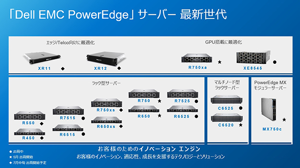 新しい世代のPowerEdgeサーバーは全部で17機種。このうち、5月に出荷が始まるのはPowerEdge R750、PowerEdge R650、PowerEdge R750xa、PowerEdge C6520、PowerEdge MX750cの5機種。売れ筋になると思われるのは、R750(2U高)とR650(1U高)の2機種。R750xaはGPUワークロード向けの特化モデル、C6520は大規模大量コンピューティング向け、MX750cはモジュラー型の位置づけである。