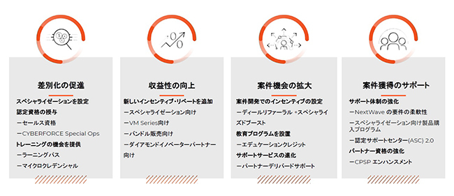 NextWave 3.0は、SASEソリューション「Prisma Access」、クラウドセキュリティソリューション「Prisma Cloud」、脅威の検知や対処、オペレーションを自動化する「Cortex XDR/XSOAR」と三つのスペシャライゼーション(専門分野)でのパートナー認定制度を追加し、専門トレーニングを設けた。